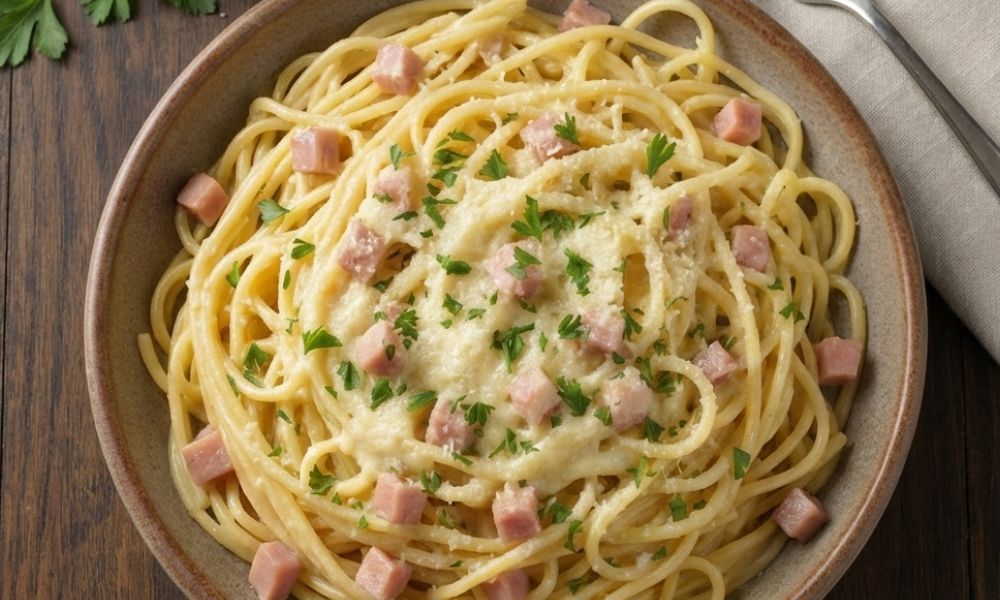 - Vierte la salsa cremosa sobre la pasta y el jamón.