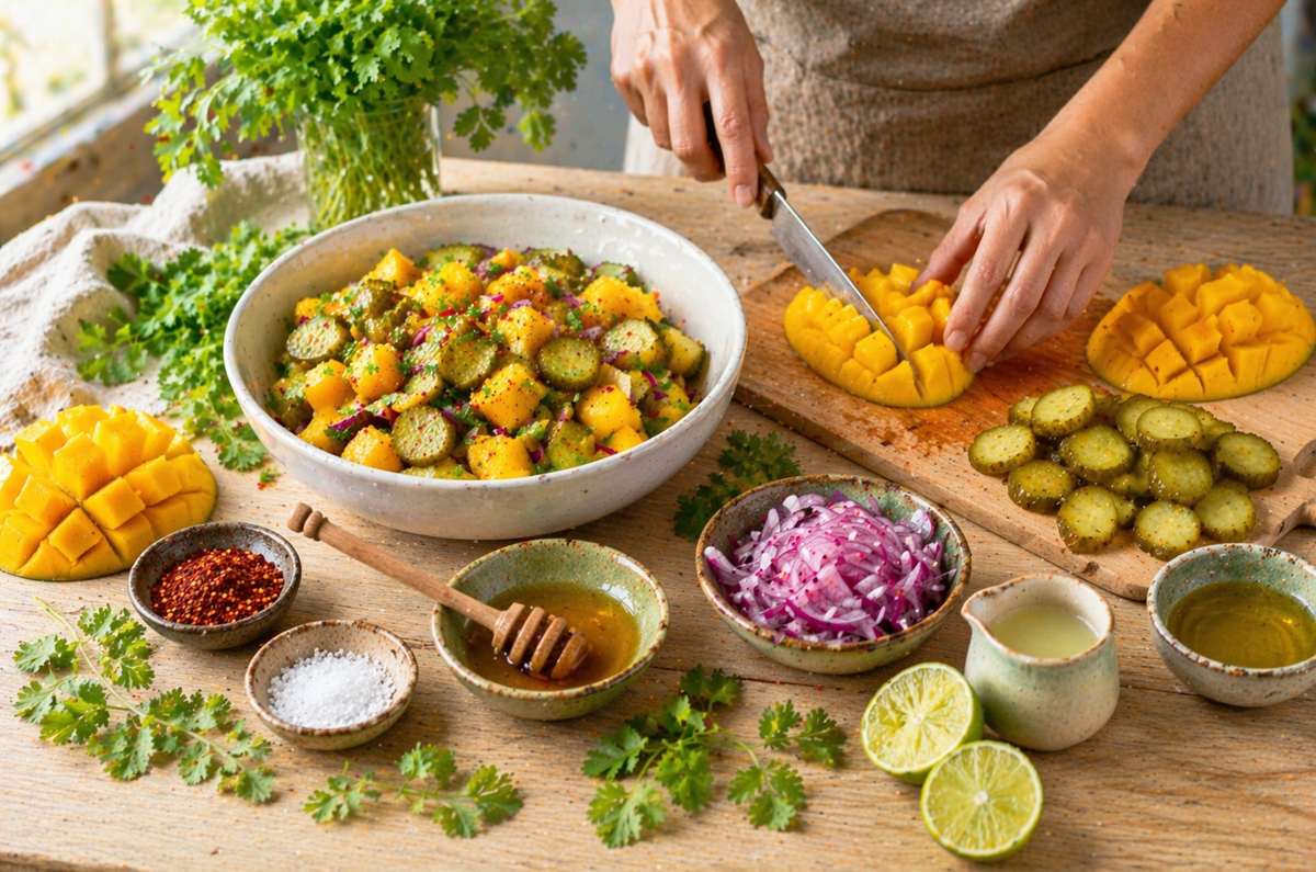 Ensalada Mango Pickle: mezcla de mango fresco, pepinillos y especias. Una receta viral fácil, refrescante y perfecta para cualquier momento.