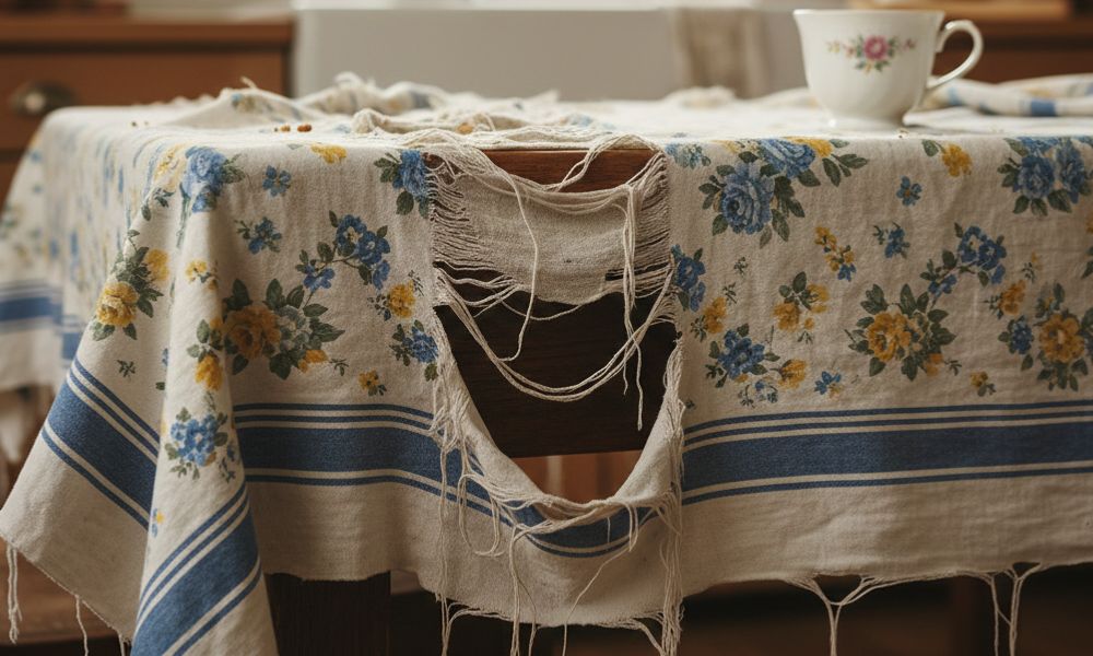 - Peligros de seguridad: un mantel roto o con bordes deshilachados puede causar accidentes, como tropiezos o caídas de objetos.
