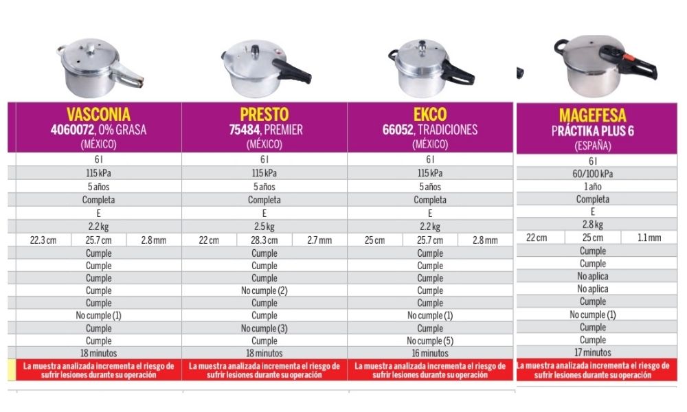Conocer las peores ollas de presión según Profeco te permite tomar decisiones informadas al comprar utensilios de cocina. Los modelos Vasconia 4060072, PRESTO 75484, EKCO 66052 y Magefesa Práctika Plus 6 presentan fallas graves de seguridad. Por lo tanto, es mejor evitarlos completamente.