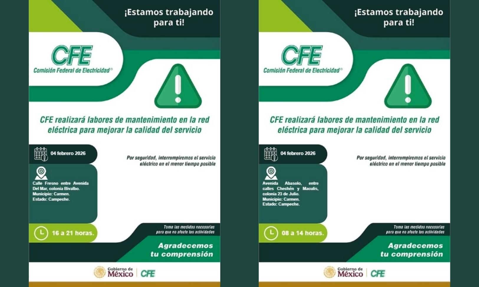- En segundo lugar, quienes residen o trabajan en avenida Abasolo deberán prepararse para un corte más prolongado. El suministro eléctrico será interrumpido desde las 8:00 hasta las 14:00 horas. Esta zona abarca el tramo entre las calles Chechén y Maculís, en la colonia 23 de Julio.