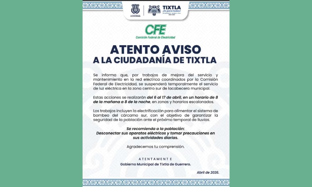 El Gobierno Municipal de Tixtla informó oficialmente sobre estas interrupciones programadas del servicio eléctrico. Según el comunicado oficial en Facebook, los trabajos permitirán electrificar el sistema de bombeo del cárcamo sur, en Tixtla. Esta obra resulta fundamental para proteger a la población durante la próxima temporada de lluvias. Además, la CFE realizará mantenimiento en la infraestructura eléctrica de la zona centro-sur. Por lo tanto, estas acciones garantizarán un servicio más eficiente y seguro para todos los habitantes.