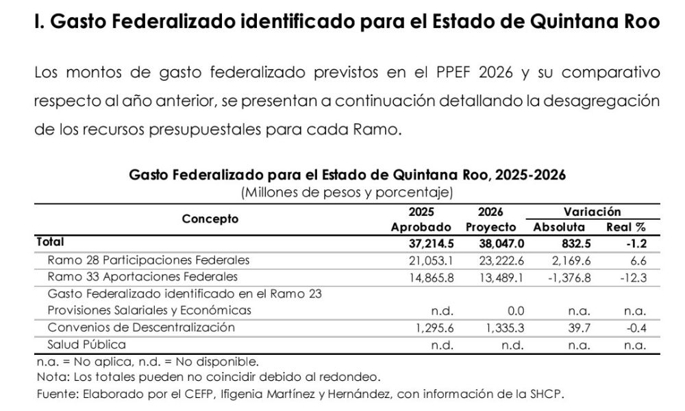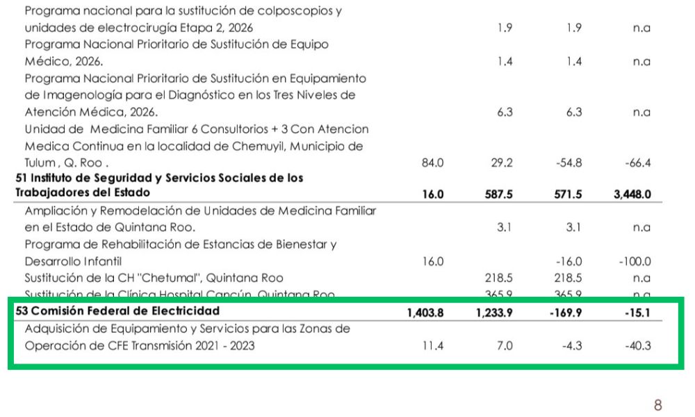 Para empeorar la situación, según información del Centro de Estudios de las Finanzas Públicas, el Proyecto de Presupuesto de la Federación 2026 contempla una reducción del 15.1% en la inversión para la CFE en Quintana Roo. Esto significa 170 millones de pesos menos que en 2025, pasando de 1,403.8 millones a 1,233.9 millones.