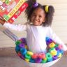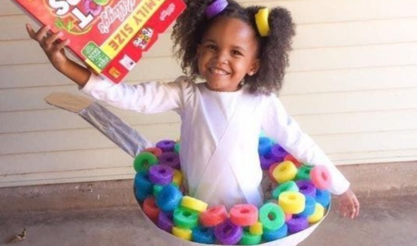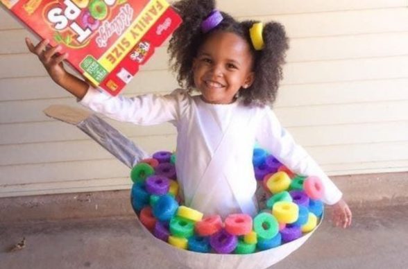 Niña con un disfraz de cereal con leche.
