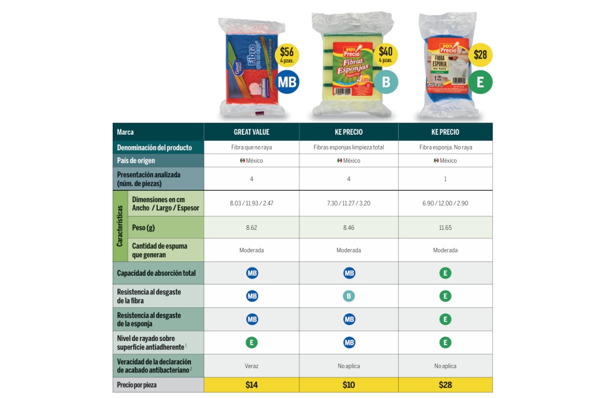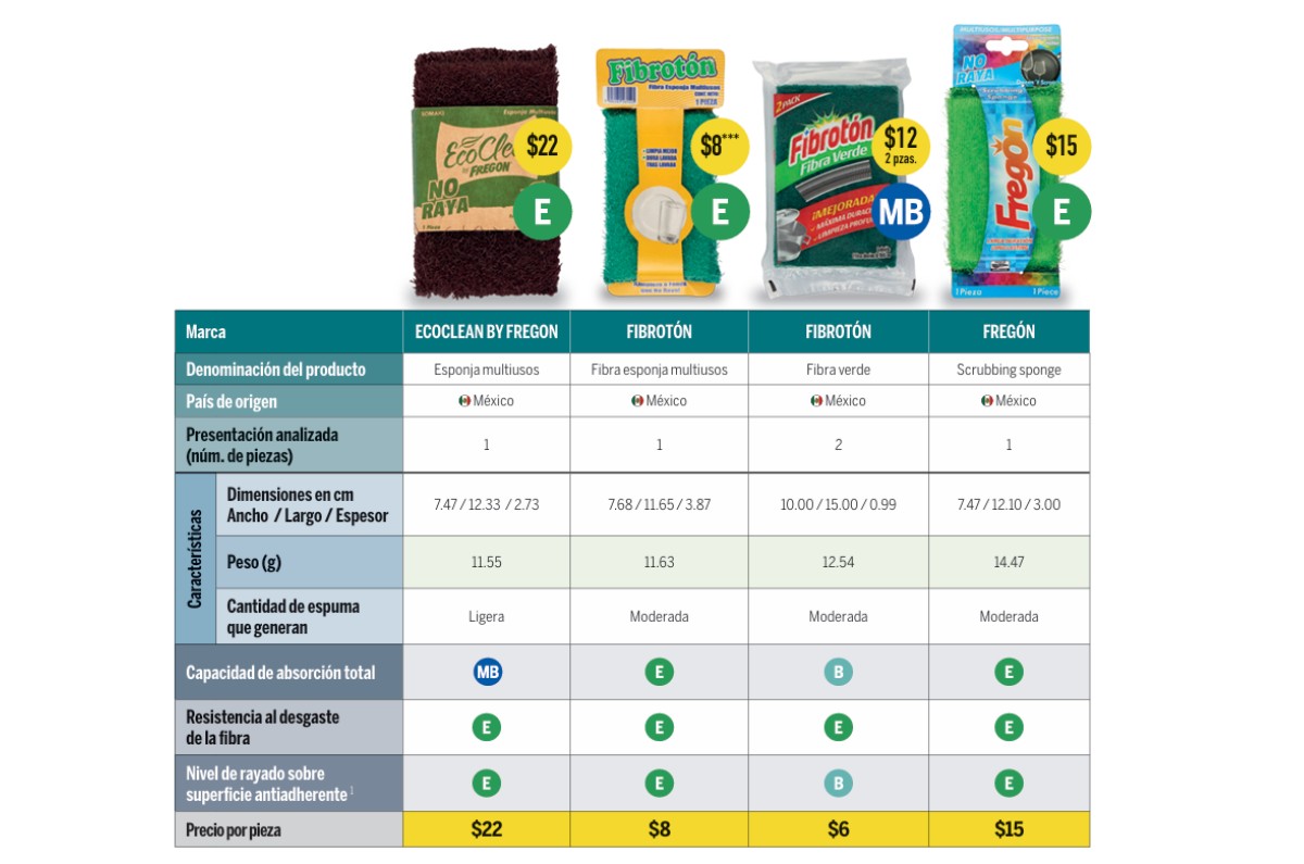 En el estudio se analizaron un total de 45 productos: 31 fibras con esponja y 14 fibras y fibras con centro de esponja. Entre las pruebas realizadas destaca: información comercial, contenido neto, evaluación de rayado, acabados, características generales, capacidad de absorción total en producto completo, resistencia al desgaste, actividad antibacteriana.