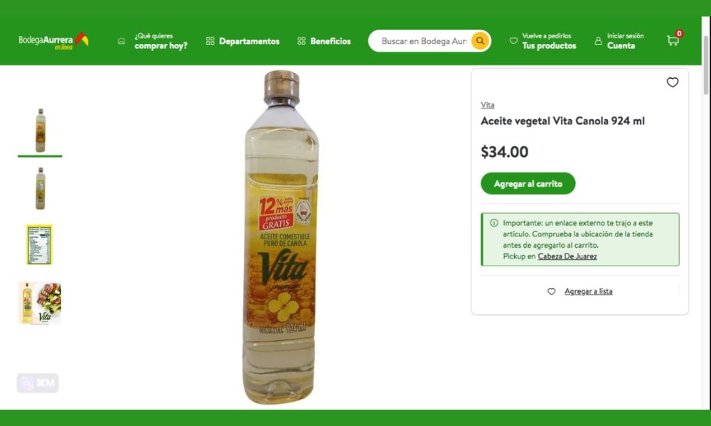 El factor económico constituye una ventaja significativa del aceite Vita. Según información verificada, este producto se comercializa en Bodega Aurrerá por tan solo 34 pesos en su presentación de 924 ml. En comparación, otras marcas populares como Capullo tienen un costo considerablemente mayor, alcanzando los 71.90 pesos en establecimientos como Soriana.