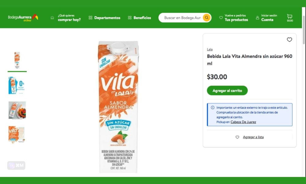 Encontrar esta bebida de almendra económica es muy sencillo. Bodega Aurrera ofrece el precio más competitivo: $30 pesos por presentación de 960 ml. Puedes adquirirla tanto en tiendas físicas como a través de su plataforma de compras en línea (aunque la oferta podría solo aplicar en su página oficial).