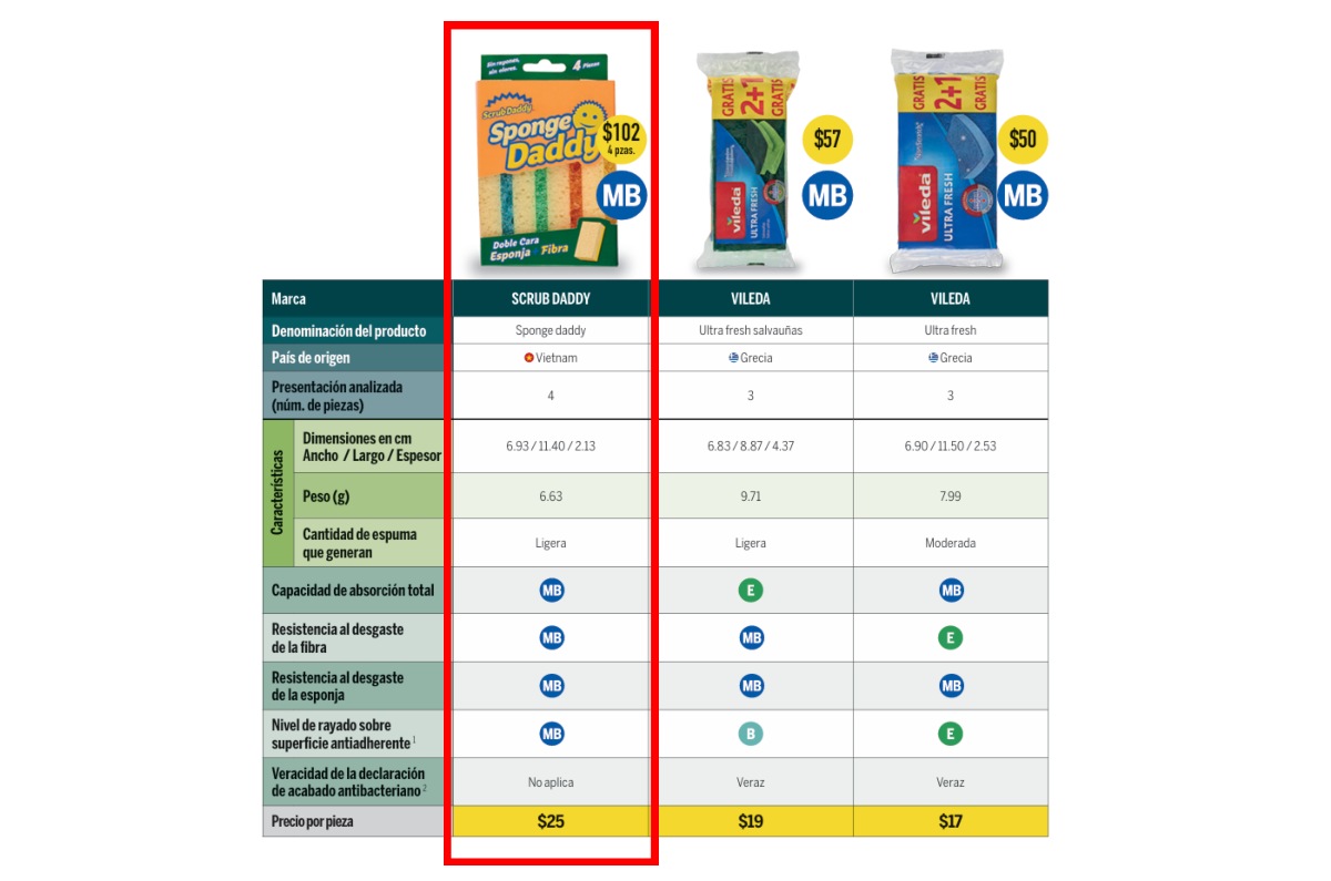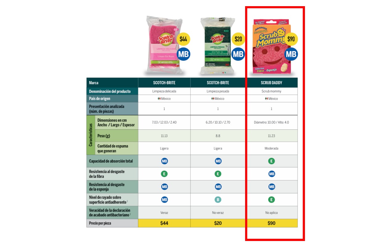 La Profeco evaluó las fibras para lavar trastes en octubre de 2025, calificando a Scrub Daddy como “Muy Bueno” en su prueba de desempeño. Solo por detrás de “Ke precio” quien tuvo la calificación “Excelente”.