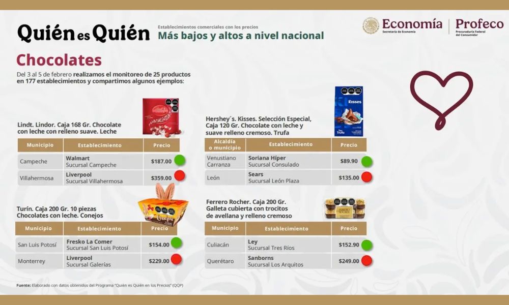 Entre el 3 y 5 de febrero, Profeco monitoreó 25 productos en 177 establecimientos. El resultado fue sorprendente: algunas tiendas ofrecían los mismos chocolates con diferencias de hasta 172 pesos. Por ejemplo, la caja de chocolates Lindt Lindor de 168 gramos costaba 187 pesos en Walmart Campeche, pero 359 pesos en Liverpool Villahermosa. Esta disparidad demuestra la importancia de comparar precios antes de comprar.