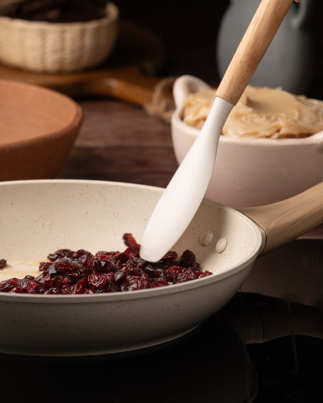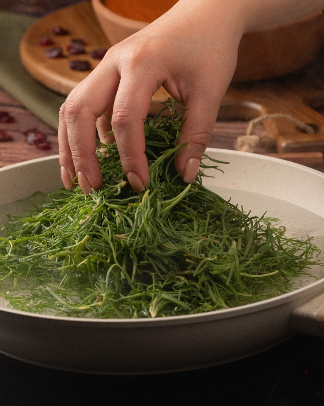 - En una sartén caliente con manteca, PON los chiles secos y los arándanos deshidratados. Retira del fuego y remoja todo en agua caliente por unos minutos para que se hidraten; este es el paso clave para que el arándano suelte ese sabor agridulce.