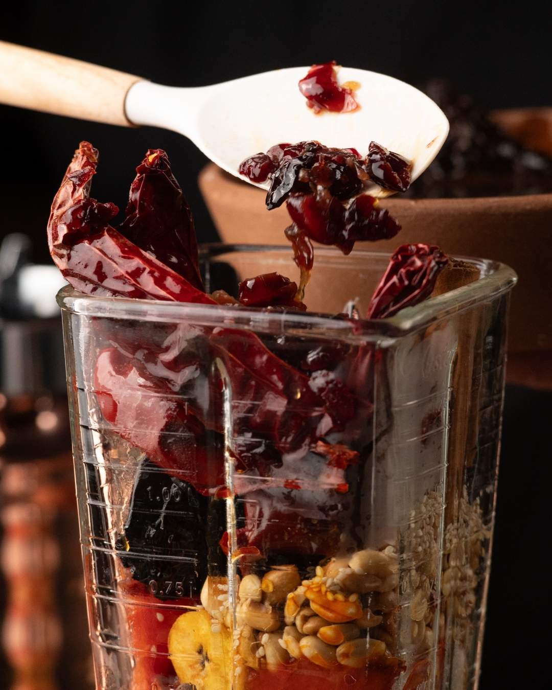 - LICÚA por partes todos los ingredientes sólidos que has preparado (chiles, arándanos, jitomate, cebolla, especias, bolillo, cacahuates) junto con el caldo de pollo, hasta obtener una mezcla lisa y uniforme.