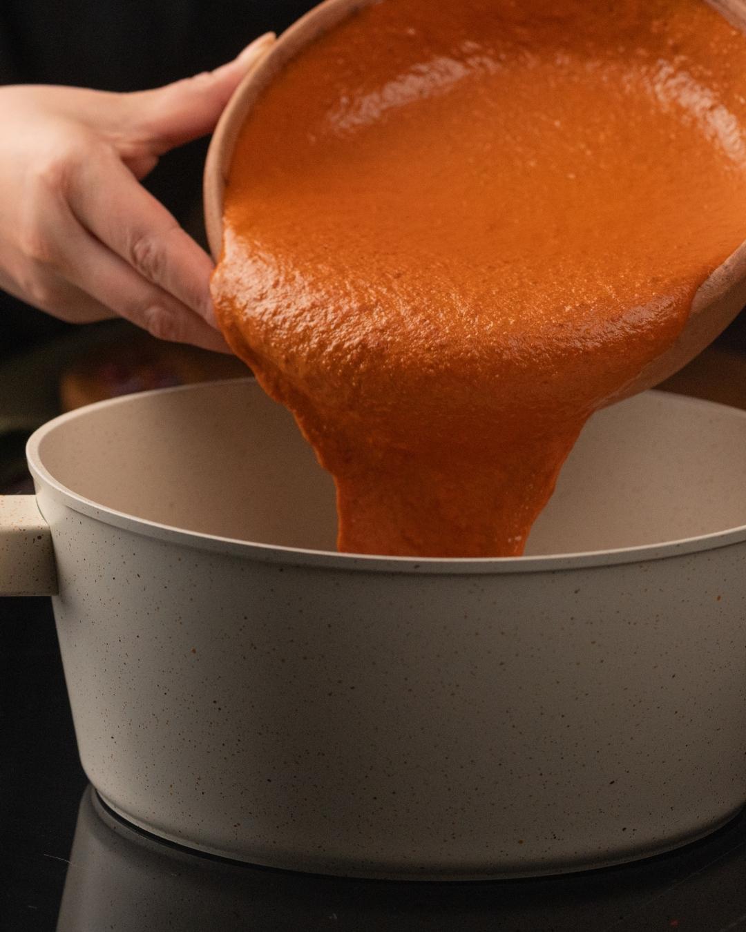 - En una cazuela grande con un poco de manteca caliente, VIERTE la mezcla licuada (puedes pasarla por un colador para una textura más tersa). Agrega el resto del caldo de pollo y el chocolate. SAZONA con sal y deja cocinar por 15 minutos.